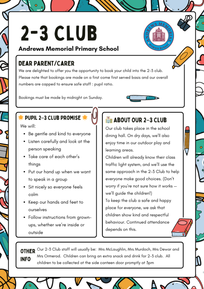 Our 2-3 club is open to children in P1, P2 and P3 with siblings in P4-7. Currently the cost is £3.00 per session; bookings must be made by Sunday evening via School Money.